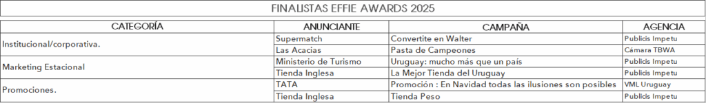 Effie® y el logo son marcas registradas de Effie Worldwide, Inc. y se utilizan bajo la licencia por la ASOCIACIÓN URUGUAYA DE AGENCIAS DE PUBLICIDAD (AUDAP). Todos los derechos reservados. Al registrarse y usar este sitio, usted está de acuerdo con nuestra política de privacidad. EFFIE AWARDS URUGUAY. E mail: info@effieuruguay.com.uy Tel: (598) 97 11 21 21